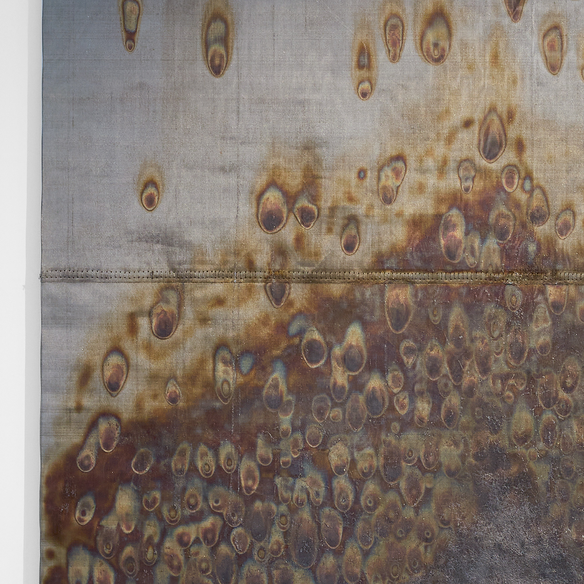 Henrik Nordahl, Seventh sense, 2024. Burned metal canvas, copper and aluminum tape, tin.