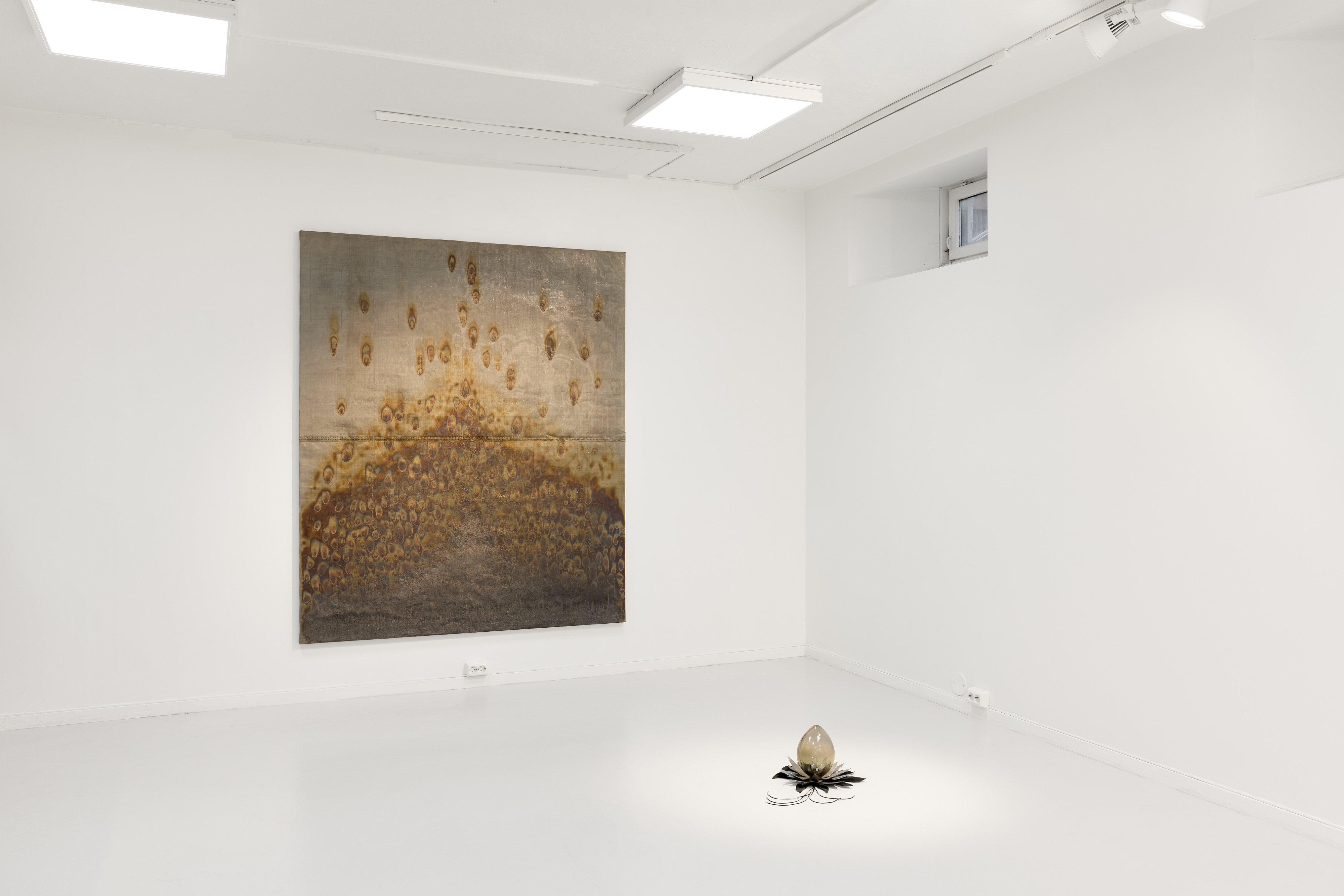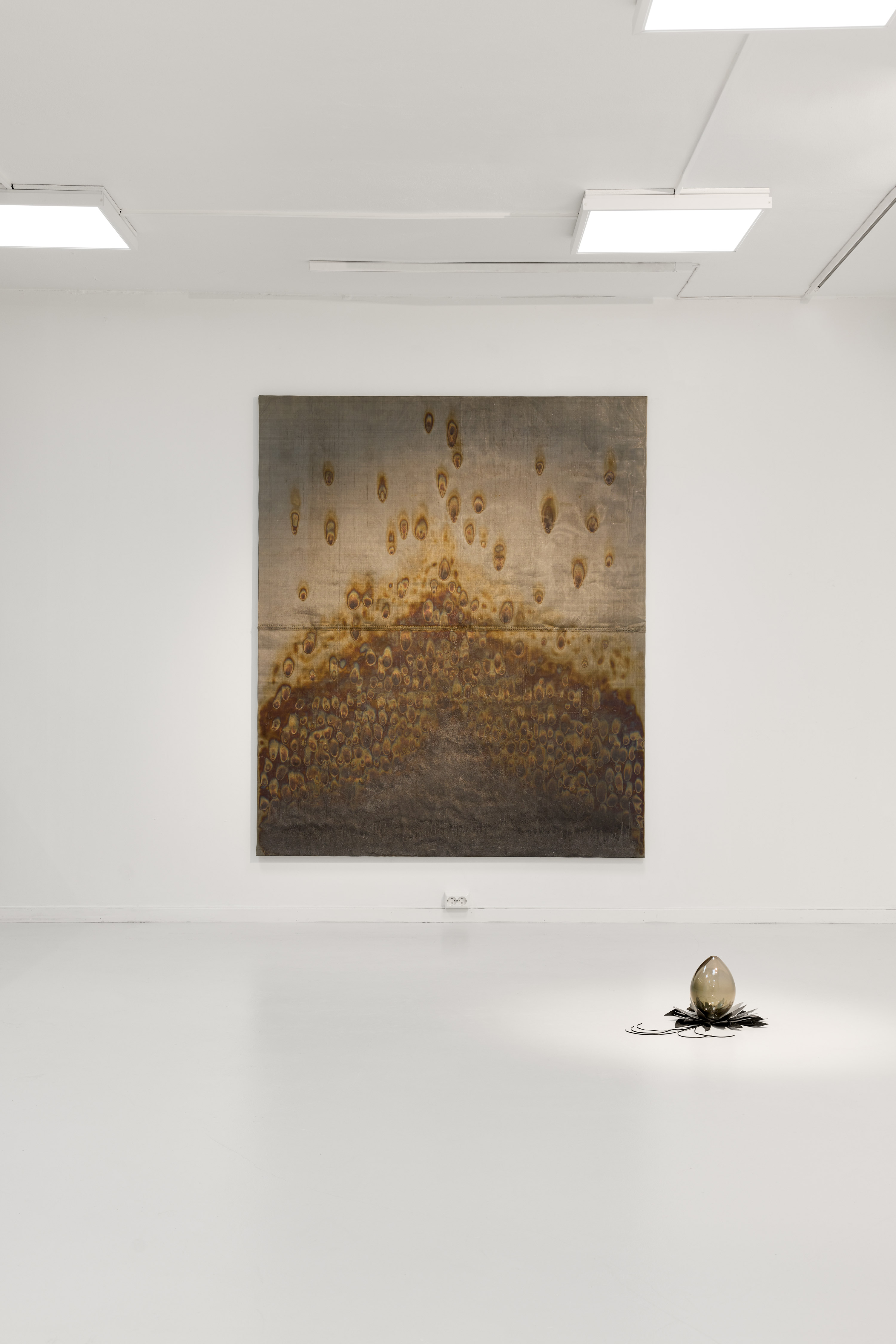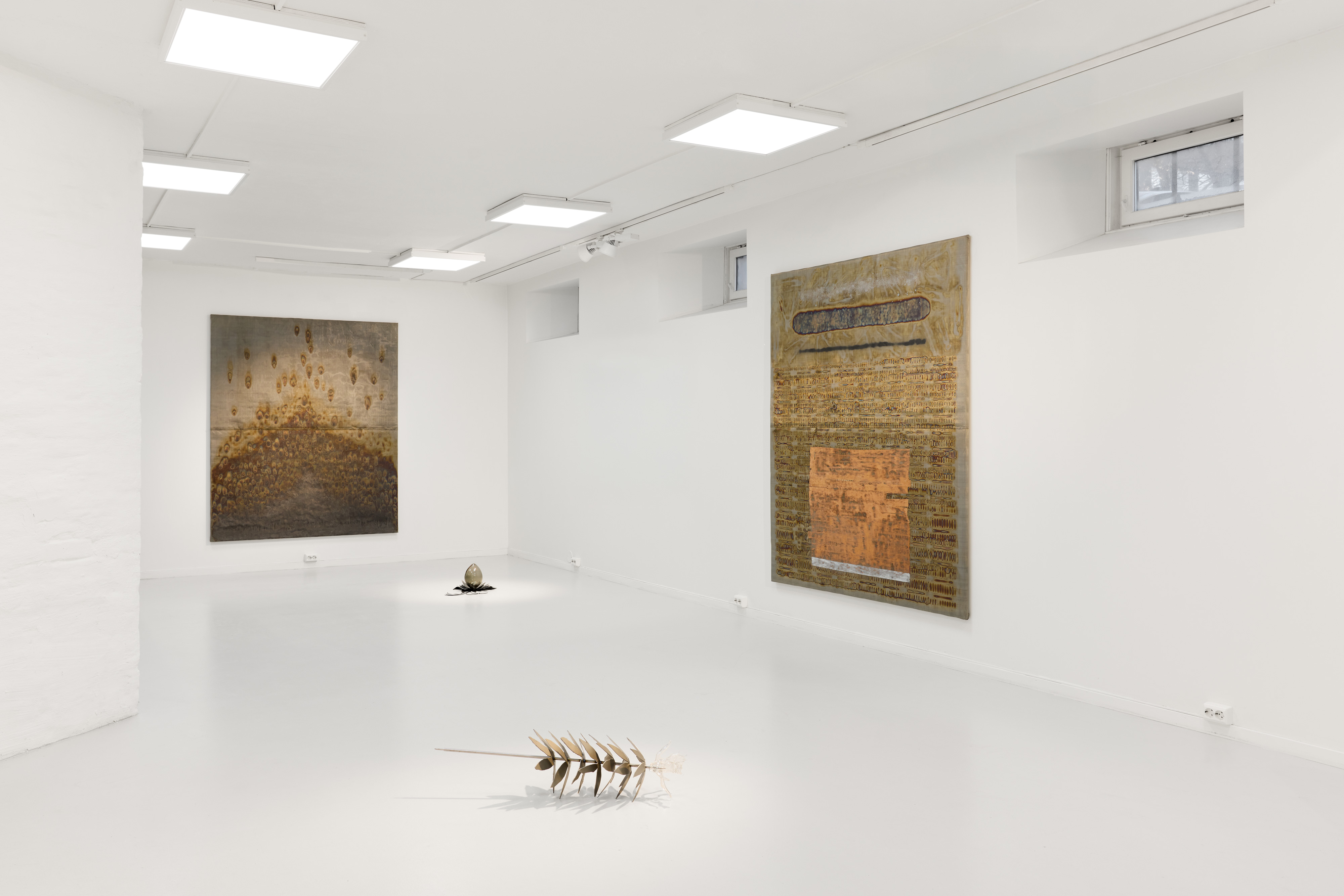 Although the artists vary in expression and materials, they are united in the contrasts between the soft and the hard, organic versus industrial, concrete and abstract. Nordahl deals with materials that we are surrounded with in our daily lives, such as strips of paper intended for joining plaster walls, and transforms them into something recognizable, yet ambiguous. With Bratsberg's oil paintings, he wants to give a language to complex human experiences in the digital age. The forms in Bratsberg's works balance between solid and fluid form, abstract mass and more clear figuration, while Lindgren works with the structures of nature, and the intersection between survival and care. Through the combination of glass and metal, Lindgren's works convey the contrast between the fragile and the threatening. Together, a space is created to explore the break between the fleeting and the stable – between what floats and what stands.